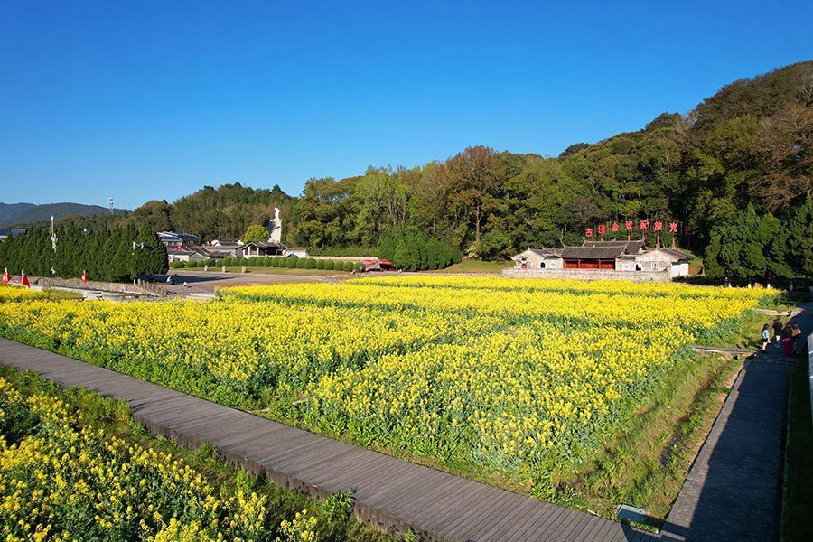 人民网龙岩3月11日电 (陈欢欢、刘晓宇)近日,在福建省龙岩市上杭县古田会议会址前,百亩油菜花迎春绽放,黄澄澄的花海如波荡漾,仿若一幅田园诗画,吸引游人踏青赏花。