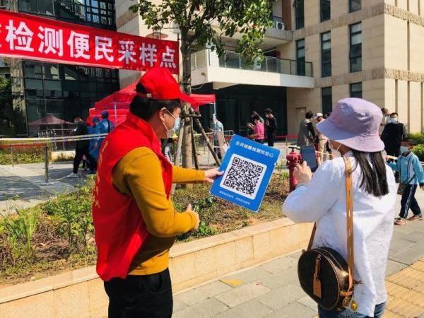在厦门,福建移动志愿者在社区核酸检测便民采样点引导市民进行预登记。